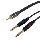 This stereo audio cable has a 3.5mm male on one end and two 1/4 inch TS male connectors on the other. It is typically used to connect audio devices such as PCs and stereo systems to the input of unbalanced pro audio equipment.