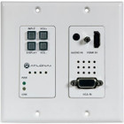 The AT-HDVS-200-TX-WP is a 2×1 wall plate switcher for HDMI and VGA inputs with HDBaseT output. It features a US, two-gang, Decora form factor with one HDMI and one VGA input with an always-on 3.5mm audio connector. HDMI signals up to 4K/UHD @ 60Hz (YUV 4:2:0 color sub-sampling), VGA input signals up to 1920×1200, embedded audio, and control signals can be extended up to 328 feet (100 meters). The switcher receives power from the AT-HDVS-200-RX scaler via Power over Ethernet and together they create a standalone AV switching and control system with scaling for classrooms and huddle rooms. Display control and volume commands are transmitted via CEC, IP, or RS-232 to any display, control system, switcher or other controllable device.